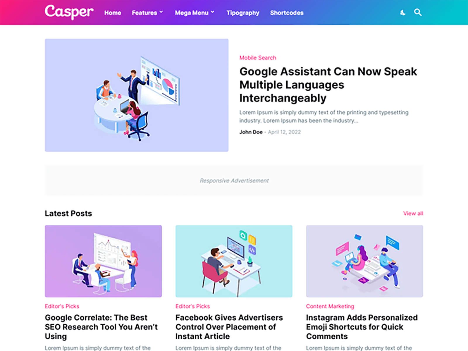 Casper is a simple, clean, flexible & powerful responsive blogger template. Casper is very fast and highly optimized for major search engine. Help Links: -> Live Preview -> Documentation